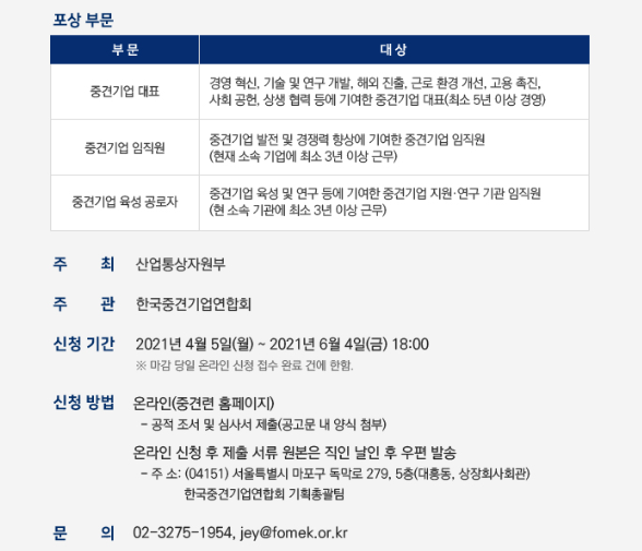 이번 유공포상 신청은 6월 4일까지로 신청자는 중견련 홈페이지(www.fomek.or.kr)에서 온라인 신청 접수를 진행해야 한다. 온라인 신청 후에는 공적 조서 및 심사서를 중견련 기획총괄팀(서울시 마포구 독막로 279, 상장회사회관 5층)에 우편으로 접수하면 된다.