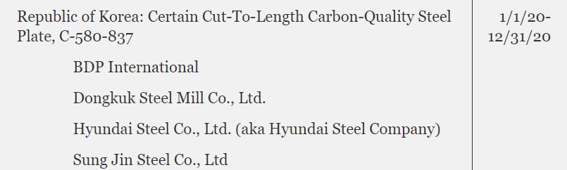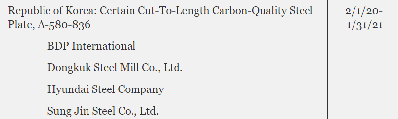한국의 경우 탄소합금후판(Certain Cut-To-Length Carbon-Quality Steel Plate)이 조사 대상으로 선정됐다. AD 조사대상기간(POR)은 2020년 2월 1일부터 2021년 1월 31일까지다. CVD 조사대상기간은 2020년 1월 1일부터 2020년 12월 31일까지다.