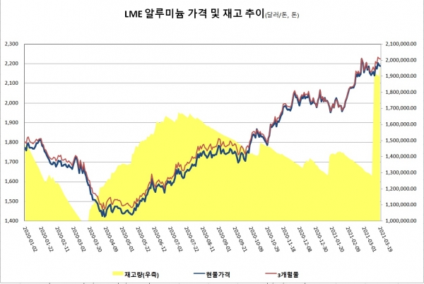 한편, 3월 LME 알루미늄 평균 가격은 톤당 2,233달러로 전월 대비 41.4달러 상승했고, 3개월물은 톤당 2,254.5러로 42.3달러 올랐다.