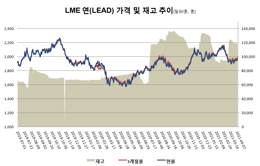 지난 2월 하순에 톤당 2,100달러대를 기록한 후 다시 약세를 보이고 있는 연 가격은 기술적으로는 하락세에 대한 매수세가 확대되면서 가격을 지지하고 있다. 메탈블리틴 등 주요 기관에서도 연 가격의 급락 가능성을 낮게 보고 있다.