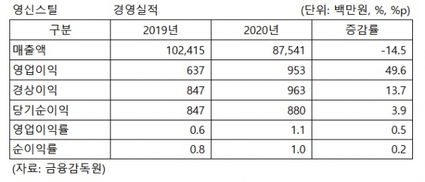 영신스틸의 2020년 영업이익은 9억5,300만원으로 2019년의 6억3,700만원 대비 49.6% 증가했고, 영신스틸의 2020년 당기순이익은 8억8,000만원을 기록해 2019년의 8억4,700만원 대비 3.9% 증가했다.