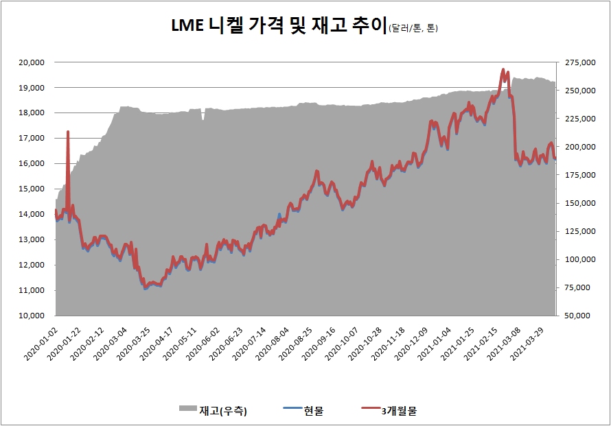 공급 증가 가능성에 더해 페로크로뮴, 코발트, 몰리브데넘 등 특수강 합금원료인 금속들이 3월 이후 조정을 나타내는 등 특수강 수요 섹터가 재고소진 흐름을 보이고 있는 것도 니켈 시장을 압박하고 있다.