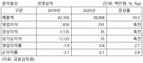 그러나 광덕철강의 2020년 영업이익은 2억9,100만원으로 2019년의 8억1,000만원 적자 대비 흑자로 전환됐고, 당기순이익 역시 3,500만원을 기록해 2019년의 11억3,500만원 적자 대비 흑자로 전환했다.