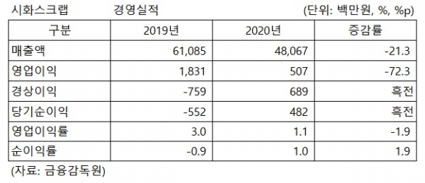 이로써 시화스크랩의 2020년 매출액영업이익률은 1.1%를 기록해 2019년의 3% 대비 -1.9%p 감소했고, 매출액순이익률은 1%를 기록해 2019년의 -0.9% 대비 1.9%p 증가했다.