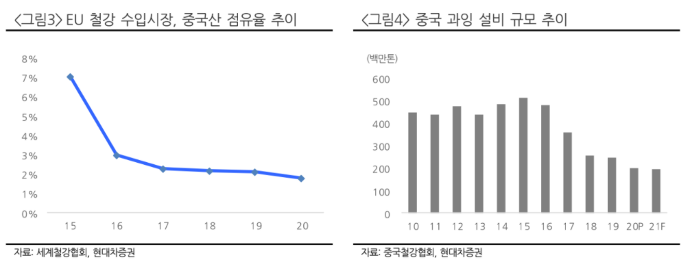 박현욱 연구원은 근거로 중국 철강 시장 동향을 소개했다. 그는 “올해 중국의 과잉설비는 1.7억톤 수준으로 추정된다”며 “이는 철강 경기가 장기간 호조였던 지난 2008년보다 적은 수준으로 2016~2018년 설비 감축 시행 이후 신규 증가 능력은 제한적이 였던 가운데 철강 수요는 꾸준히 증가했기 때문”이라고 말했다.