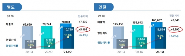 포스코는 1분기 판매가격 상승에 의한 밑마진 개선으로 별도기준 영업이익이 전분기 대비 증가했다. 연결기준 영업이익도 철강, 글로벌 인프라, 신성장 전 부문 실적 개선으로 전분기 대비 늘어났다.