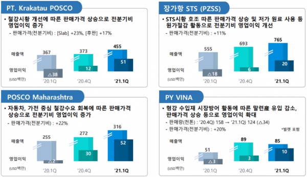 포스코의 4개 해외 자회사 영업이익이 모두 전분기 대비 개선된 것으로 나타났다.