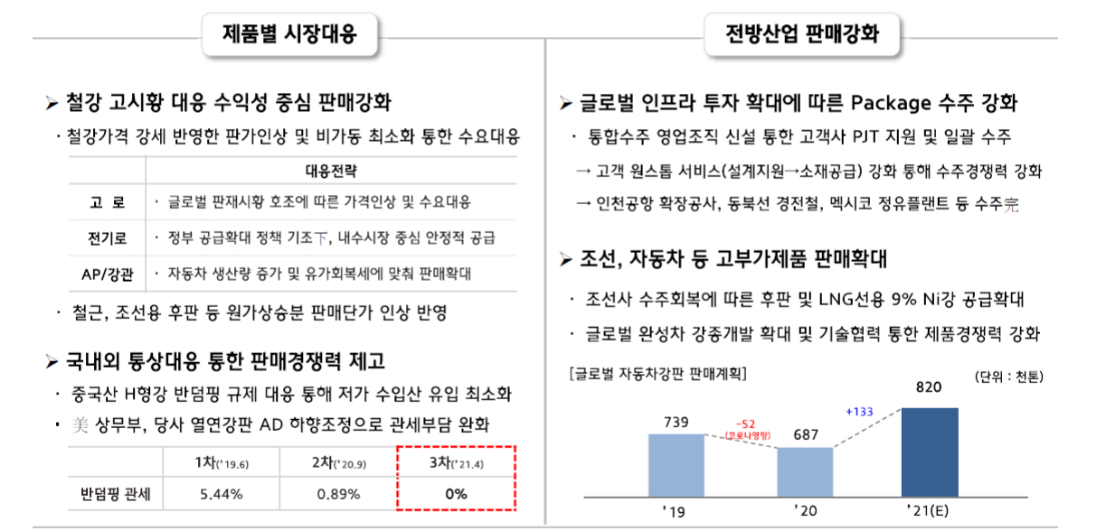제품별 시장 대응은 철강 고(高)시황에 대응하여 수익성 중심 판매 강화에 나선다는 전략이다. 고로 제품의 경우 글로벌 판재 시황 호조에 따른 가격 인상과 수요대응이 추진된다. 전기로 제품은 주택 정부 공급확대 정책 기호 하에 내수 시장 중심으로 안정적 공급하도록 조치된다. AP/강관 제품 등은 자동차 생산량 증가와 유가(油價) 회복세에 맞춰 판매를 확대할 계획이다.