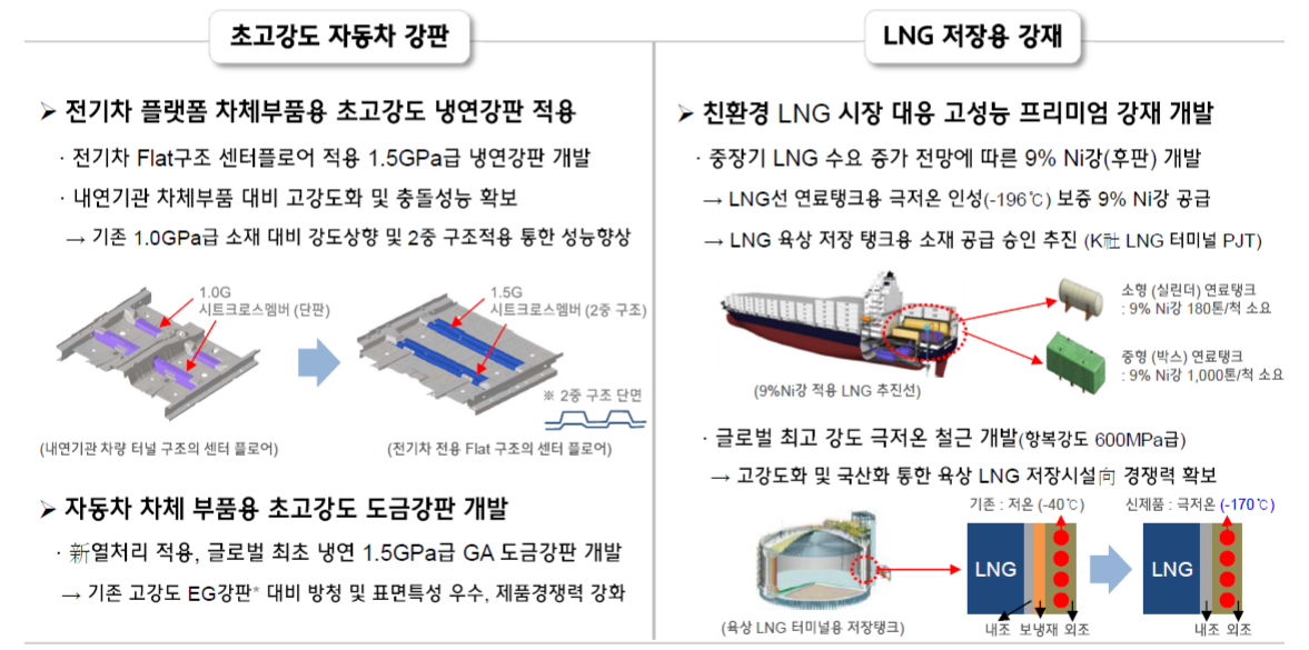 자동차 부문에서는 초고강도 강판 기술이 개발 및 기술 적용될 예정이다. 특히 전기차 플랫폼 차체체부품용 초고강도 냉간압연강판(냉연강판) 적용이 본격화된다. 이와 관련해 전기차 플랫(Flat) 구조 센터터플로어 적용을 위한 1.5Gpa급 냉연강판 개발이 이뤄졌다. 내연기관 차체부품과 대비 고강도화 및 충돌성능이 뛰어난 것이 장점이다. 기존 1.0Gpa급 소재보다 강도가 상향됐고 이중 구조 적용으로 성능도 향상됐다.