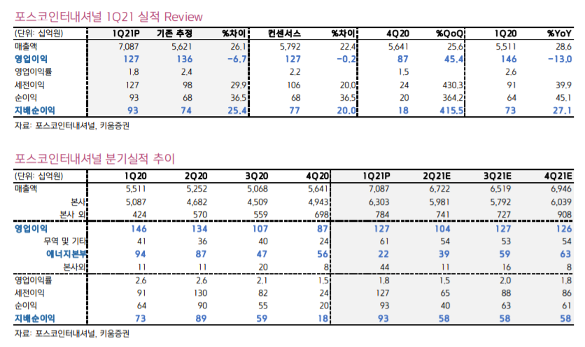 이종현 연구원은 매출액 증가 원인이 그룹 내 판매채널 통합효과와 글로벌 수요 회복으로 철강재 판매가격이 증가했기 때문으로 봤다. 그는 “1분기 철강 판매량은 969만톤으로 전년 동기 대비 62% 상승했다”라며 “미얀마 가스전 이익 부진에도 트레이등 부문 및 주요 투자법인 이익 증가로 수익성을 방어했다”라고 밝혔다.
