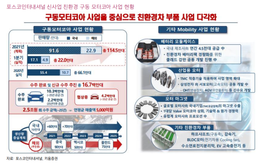 아울러 이종현 연구원은 자회사인 포스코에스피에스의 구동 모터코아 사업 실적도 긍정 평가했다. 이 연구원은 “구동 모터코아 판매 실적이 1분기에 22만대를 기록한 가운데 올 한해 약 115만대(YoY 73%) 판매가 예상된다”라며 “신규 전기차 출시가 이어짐에 따라 판매량 증가와 함께 시장의 주목도도 커질 것으로 기대된다”고 전했다.