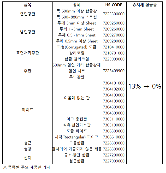 열연강판·냉연강판·스테인리스·강관·철근 등 주요 철강재 환급률 ‘0%’