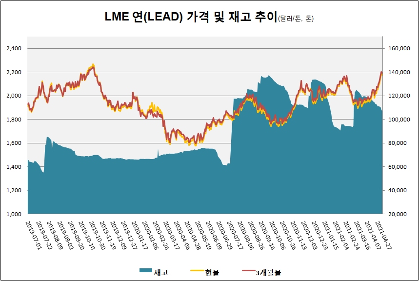 지난 6일 런던금속거래소(LME)에서 거래된 연(Lead) 현물가격은 전일대비 9달러 떨어진 톤당 2,177달러를, 3개월물 가격은 10달러 하락한 2,191.5달러를 각각 기록했다.