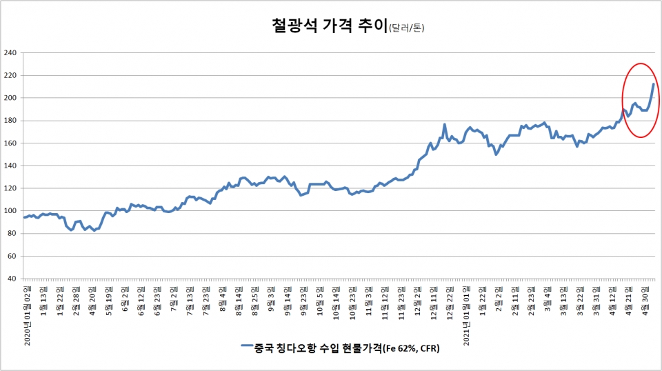 지난 10일 중국 칭다오항 기준 철광석 현물 수입가격(CFR)은 톤당 230.56달러를 기록하며 역대 최고치를 다시 갈아치웠다. 전주대비로는 18.31달러, 전월대비로는 57.02달러, 연초 대비로는 65.27달러가 상승한 가격이다.