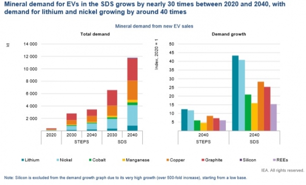 파리기후협정 목표와 일치하는 지속가능발전 시나리오(SDS)에서는 청정 에너지 기술 부분이 해당 광물자원의 주요 시장이 될 것으로 전망했다. 전기에너지 사용량 증가는 전력망 확장에 필요한 동과 알루미늄 수요 증가를 이끌 것으로 예상됐다. 특히 전기차 배터리를 포함한 에너지 저장장치 부분에서 이들 광물자원 수요는 2040년까지 약 30배까지 급증할 것으로 내다봤다. 니켈과 리튬, 코발트는 망간, 흑연과 함께 배터리 성능과 수명, 에너지 밀도 유지에 꼭 필요한 소재다.