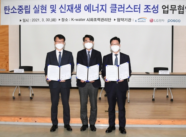 ▲ 김상균 강건재마케팅실장(오른쪽)이 최근 안산 시화조력발전소에서 한국수자원공사 박평록 시화사업본부장(가운데), LG전자 이재성 에어솔루션사업부장과 시화호 신재생에너지 클러스터 조성 MOU를 체결한 후 기념촬영을 하고 있다.=사진 포스코