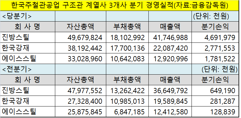 한국주철관공업이 금융감독원에 제출한 분기보고서에 따르면 구조관 계열사 3개사의 총 매출액은 767억5,300만원, 순이익 92억4,300만원을 기록했다. 지난해 같은 기간 매출액 686억5,000만원 , 순이익 10억5,800만원에 비해 크게 개선된 실적이다.
