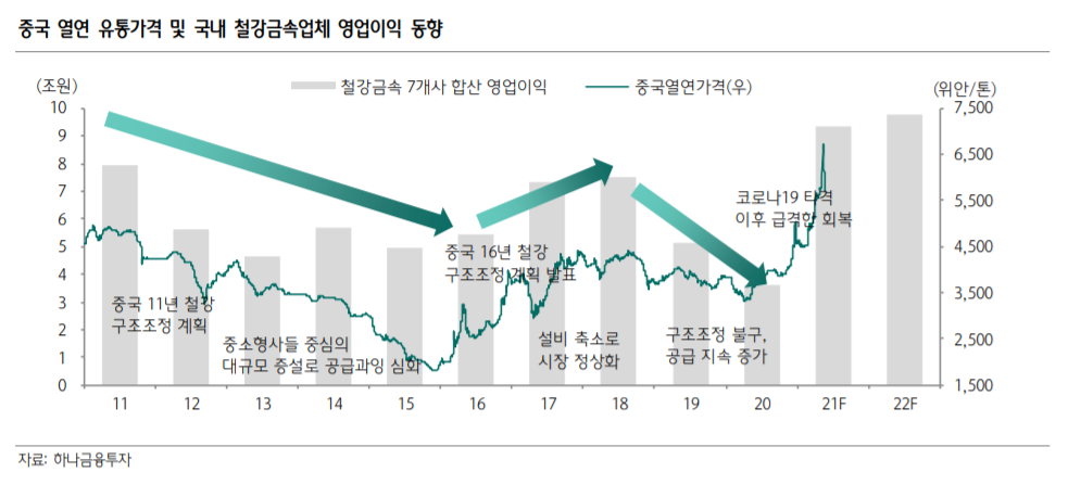 박 연구원은 “최근 중국 정부가 원자재가격 과열에 대한 불편한 심리를 드러내며 철강가격 하락에 대한 우려가 커졌다”고 지적하며 “다만 지난 2016~2017년에도 중국 정부가 규제에 나섰음에도 철강가격 강세가 지속된 바 있고, 과거와 달리 중국의 조치가 전 세계 철강가격에 미치는 영향이 제한적일 것으로 예상된다”고 말했다.