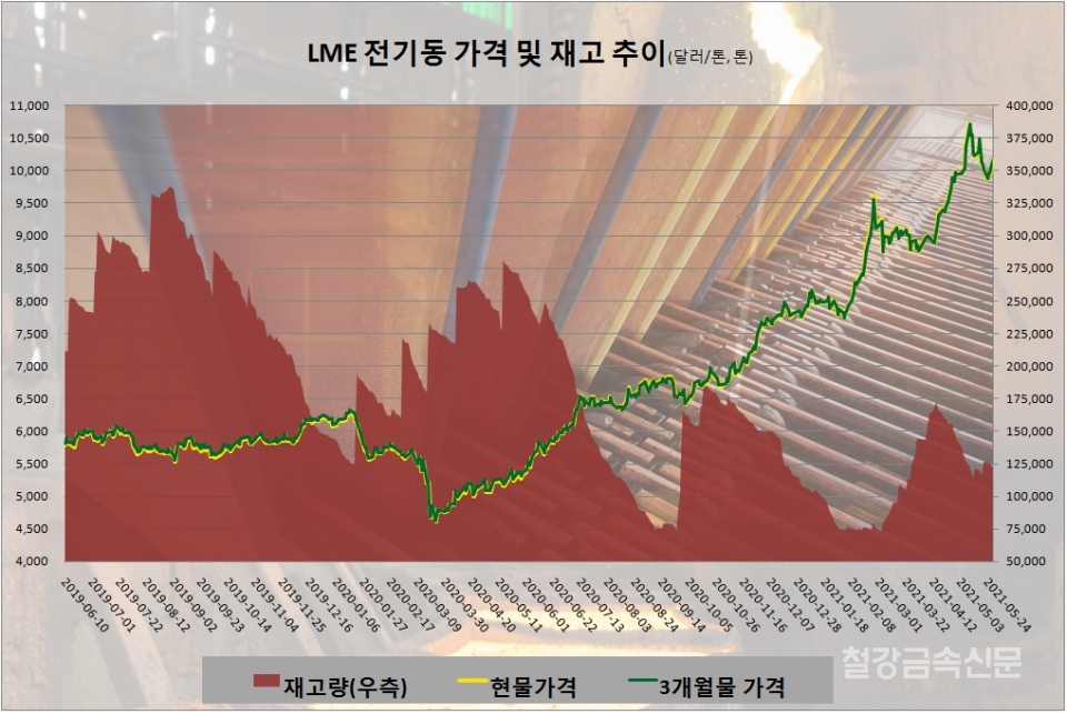 한편 31일에 LME가 휴장함에 따라 5월 전기동 현물가격 평균은 전월대비 848.42달러 상승한 1만183.97달러를 기록했다. 이로 인해 6월 국내 전기동 판매가격은 추가로 90만원 이상 오를 것으로 예상된다.