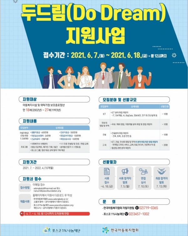 올해 두드림 참가자 모집은 6월 7일부터 18일까지다. 1차 서류 합격자를 대상으로 면접 심사를 거쳐 오는 7월 최종합격자 65명을 발표할 계획이다. 전국 아동복지시설(위탁가정 및 그룹홈 포함) 보호종료청년으로 타기관의 지원을 받고있지 않는 만18세~27세면 누구나 지원 가능하다. 자세한 내용은 포스코1%나눔재단(poscofoundation.org)과 한국아동복지협회(adongbokji.or.kr) 홈페이지에서 확인 가능하다.
