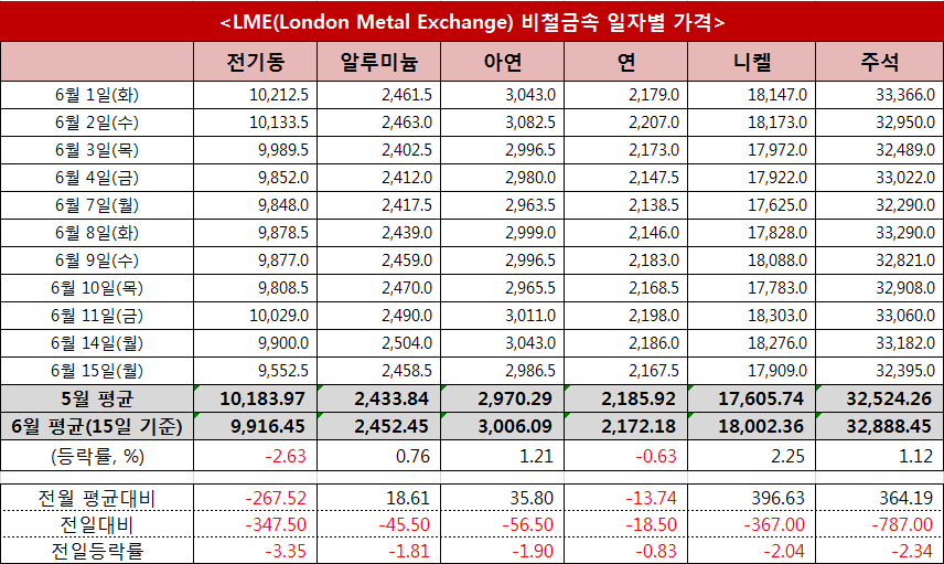 지난 15일 LME 비철금속 오피셜 현물가격은 전기동(-3.35%), 주석(-2.34%), 니켈(-2.04%), 아연(-1.90%), 알루미늄(-1.81%), 연(-0.83%) 등 6대 품목 모두 전일대비 하락했다.