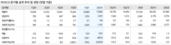 깜짝 실적의 배경은 전분기 대비 톤당 8만300만원(탄소강 기준) 상승한 출하 단가다. 톤당 마진 스프레드는 전분기 대비 6만원 이상 개선됐다. 2분기 연결 기준 영업이익은 전년 동기 대비 897.7% 늘어난 1조6,700억원으로 예상된다.