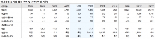현대제철의 1분기 영업이익은 3,039억원으로 영업이익률은 7.0%다. 판재 출하 단가가 전분기 대비 톤당 9만원가량 상승해 톤당 마진 스프레드는 6만원 이상 개선됐다.