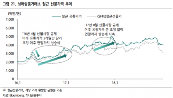 최근 상해와 대련 상품거래소의 철강·철광석 선물 계약에 대한 규제가 발표되면서 선물 가격이 떨어졌고 중국 철강 유통 가격도 규제 이전 대비 15%가량 하락했다. 중국은 2016년과 2017년에도 선물 시장 규제를 통한 철강 시장 과열 억제를 시도한 바 있다. 2016년에는 철강 유통 가격이 2개월간 하락했으나 이후 연말까지 오름세가 지속됐다. 2017년의 경우 별다른 조정 없이 연말까지 강세가 이어졌다.