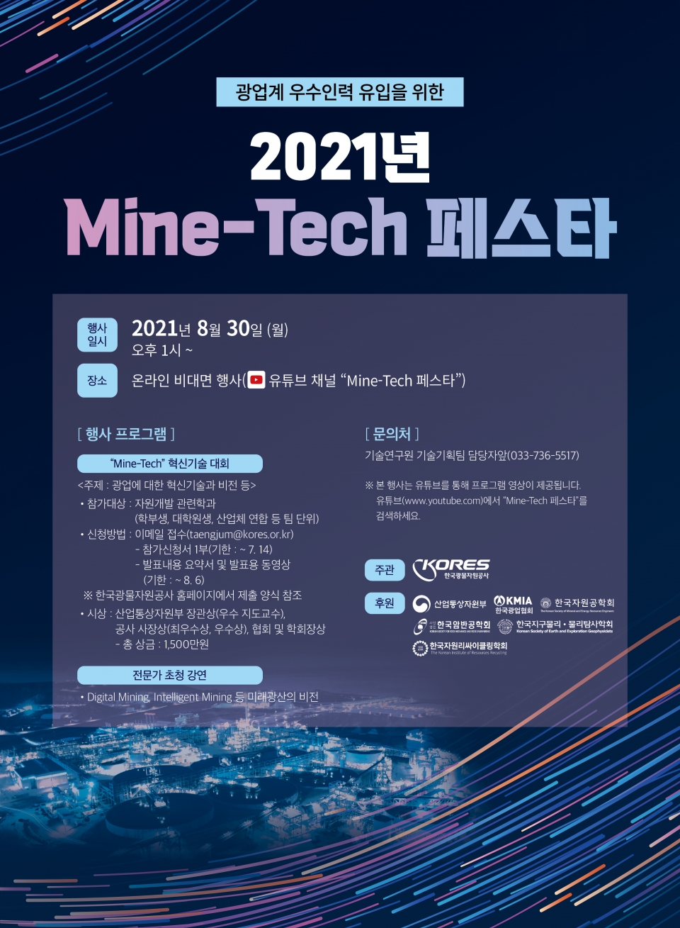 한국광물자원공사(사장 황규연)는 광업계 기술 교류 증진과 젊은 우수 인력 유입을 위해 국내 대학생들이 겨루는 ‘2021년 Mine-Tech 페스타’를 오는 8월 30일 개최한다고 27일 밝혔다.