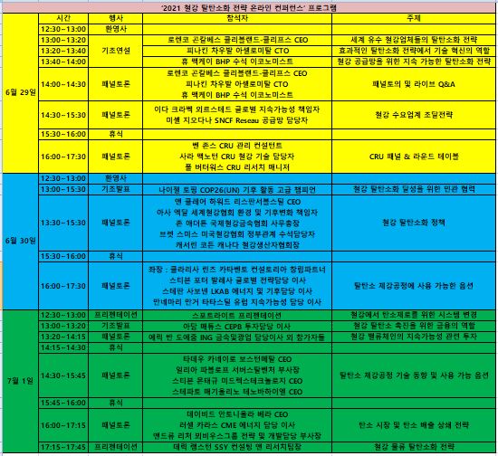 이번 행사에는 로렌코 곤칼베스 클리블랜드-클리프스 CEO, 피나킨 차우발 아셀로미탈 CTO, 휴 맥케이 BHP 수석 이코노미스트, 사라 맥노턴 CRU 철강 기술 담당자 등 세계 철강업계와 금융업계의 전문가들이 ‘철강산업의 탈탄소화를 위한 기술, 정책 및 금융투자 모델’ 등에 대해 논의할 계획이다. 자세한 내용은 아래의 도표에서 볼 수 있다.