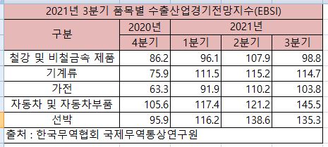 한국무역협회가 발표한 ‘2021년 3/4분기 수출산업경기전망조사(EBSI)’에 따르면 2021년 1분기 수출산업경기전망지수(EBSI)는 113.5를 기록해 지난 1분기(112.1), 2분기(120.8)에 이어 3분기 연속 110을 상회하면서 견조한 성장세를 유지할 것으로 전망했다.