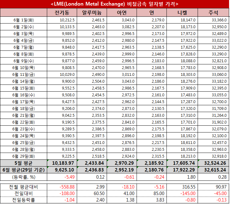 지난 29일 런던금속거래소(LME)에서 거래된 비철금속 오피셜 현물가격은 전기동이 톤당 9,225.5달러(-108달러), 알루미늄 2,518.5달러(+60.5달러), 아연 2,924.0달러(+41달러), 연 2,315.5(+85달러), 니켈 1만8,213달러(-145달러), 주석 3만2,918달러(-45달러)를 각각 기록했다.