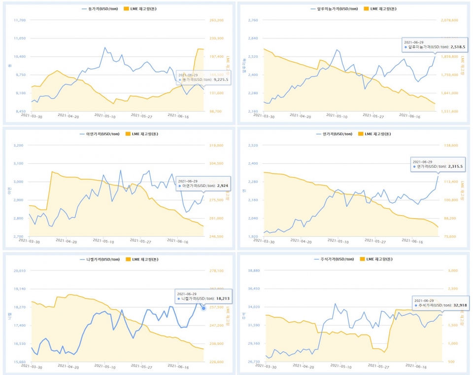 비철금속 가격이 달러화 강세 및 델타 변이 바이러스 확산 우려 지속에 품목별로 혼조세를 보였다. 연, 알루미늄, 아연 가격은 비교적 큰 폭으로 오른 반면에 전기동, 니켈, 주석 가격은 하락했다. 특히 마감종가 기준으로는 전기동 가격만 유일하게 하락하며 다시 약세 움직임이 뚜렷해지고 있다.