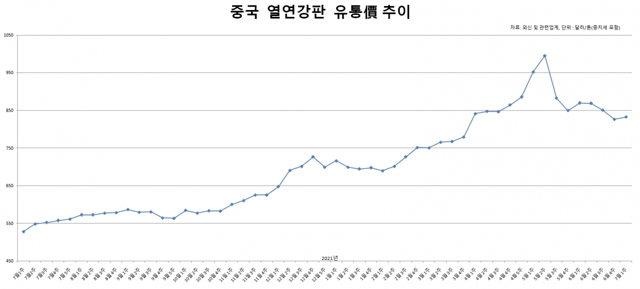 철강업계 및 외신에 따르면 7월 첫째 주, 현지 HR 유통가격은 톤당 833달러(증치세 포함)를 기록했다. 직전 주 대비 톤당 5달러 상승했다. 지난 3주 연속 하락하던 가격 흐름이 7월 초순 들어 반등했다.