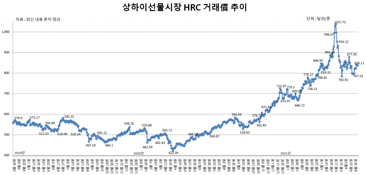 수출 가격 산정에 영향을 미치는 선물거래가격도 6월 하순 톤당 700달러대 후반대 수준에서 7월 초순 톤당 800달러대를 회복했다. 첫째 주, 상하이선물거래소에서 열연 코일 거래가격은 톤당 832.7달러(5,383위안)을 기록했다. 직전 주 대비 약 31달러, 3.9% 상승했다.