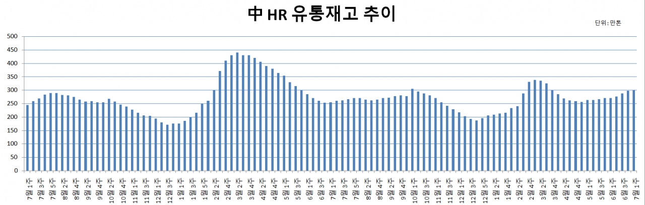 첫째 주, 현지 HR 유통재고는 301만톤으로 9주 연속 소폭의 증가세를 이어나갔다. 아울러 현지 유통재고가 300만톤 수준을 기록한 것은 지난 3월 하순 이후 약 4개월 만에 일이다. 이에 일반 제조업을 중심으로 철강 수요가 일부 둔화됐다는 평가도 나타나고 있다.