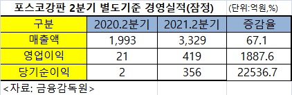 같은 기간 매출액은 3,329억원으로 67.1% 늘어났으며 당기순이익은 356억원으로 22536.7% 급증한 것으로 잠정 집계됐다.