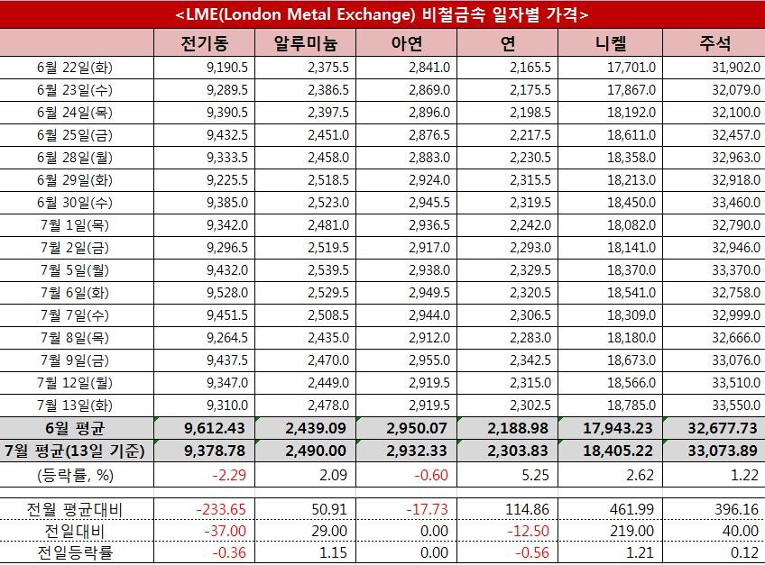 일일 LME 비철금속 시황(7월 13일)