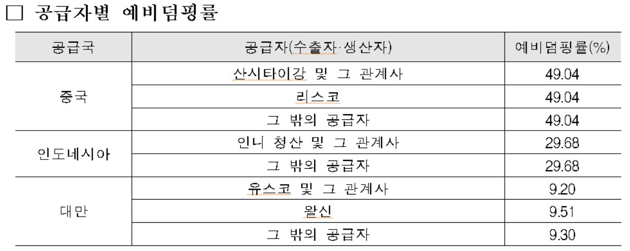 주무부처인 산업통상자원부 무역위원회를 중심으로 반덤핑 조사가 시작된 가운데 무역위는 지난 2월 예비결과 발표에서 “조사대상기간(2017년~19년) 동안 조사대상 공급국으로부터의 수입물량이 증가하고 국내 시장점유율도 상승하였다”라며 “이로 인해 국내 동종물품의 판매량 감소, 시장점유율 하락, 이윤감소 등 피해가 발생하였다”면서 중국산에 49.04%, 인도네시아산에 29.68%, 대만산 9.2~9.51%에 예비관세를 부과한 바 있다.