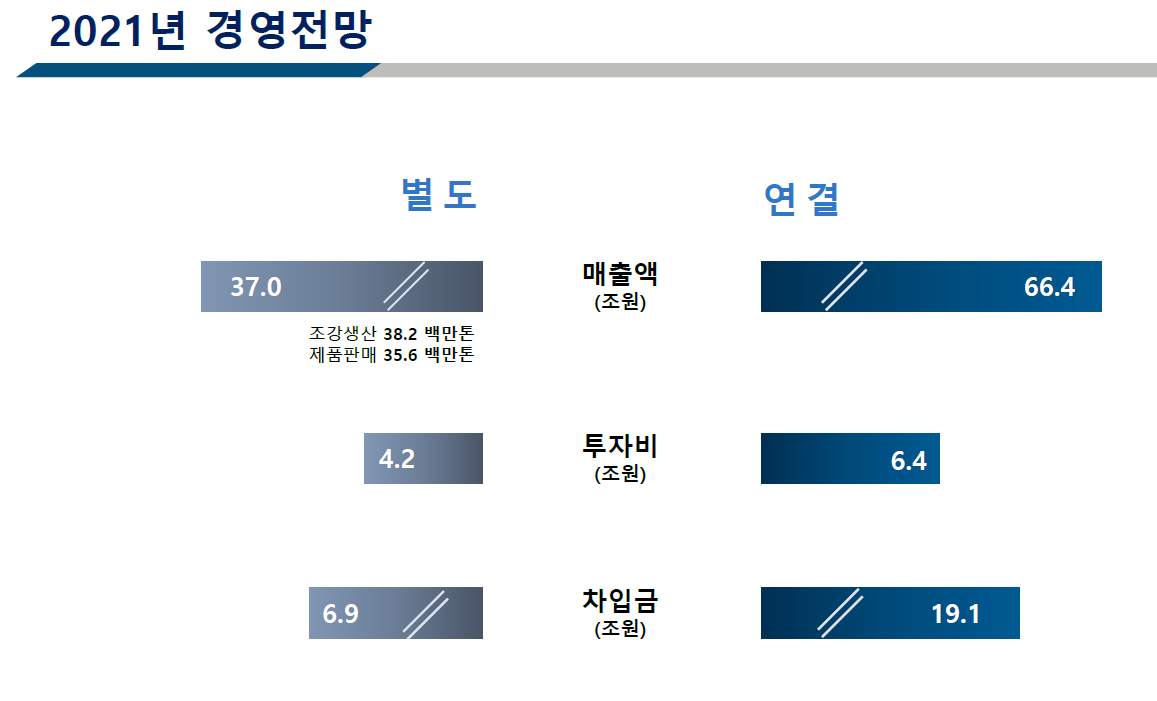 포스코는 2021년 연간 경영 전망으로 연결기준 매출액 66조4천억원, 투자비 6조4천억원, 차입금 19조1천억원을 예상했다. 별도기준으로는 매출액 37조원(조강생산 3,820만톤, 제품판매 3,560만톤), 투자비 4조2천억원, 차입금 6조9천억원을 전망했다.