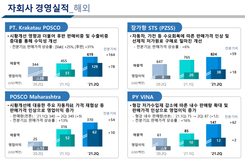 인도네시아 'PT. Krakatau POSCO'는 시황개선 영향과 후판 판매비중 및 수출비중 증대로 수익성이 개선됐다.
