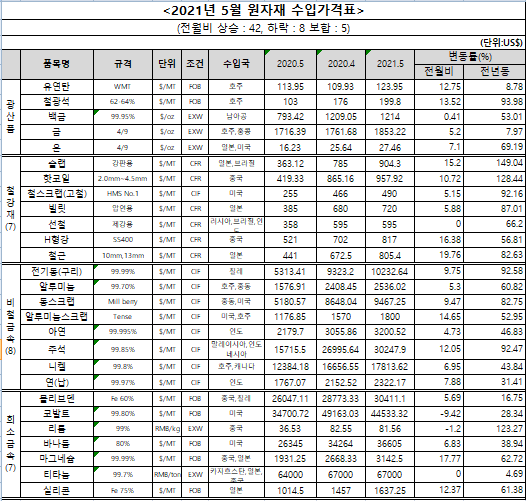 한국수입협회에 따르면 철강재(10.03%)는 글로벌 철강 수요의 전반적 강세와 더불어, 중국정부가 5월 1일자로 철강품목의 수출증치세 환급을 전면 폐지하여 전월 대비 가장 크게 올랐다. 광산품(8.24% 상승)은 유연탄, 철광석 등의 수요가 늘어 상승했고, 비철금속(8.66%)은 전반적인 수요 호조로 상승했다. 희소금속(1.00%) 또한 생산원가의 상승과 수요의 증가로 소폭 상승했다.