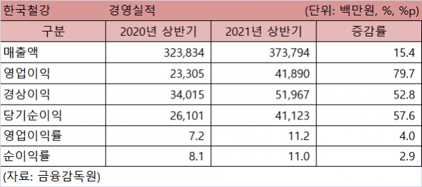 금융감독원 전자공시에 따르면 한국철강의 2021년 상반기 매출액은 3,737억9,400만원을 기록해 2020년 상반기 3,238억3,400만원 대비 15.4% 증가했다. 올해 상반기 영업이익 또한 418억9,000만원을 기록해 지난해 같은 기간 대비 79.7% 늘어난 것으로 나타났다. 당기순이익은 411억2300만원으로 전년 동기 대비 57.6% 증가했다.