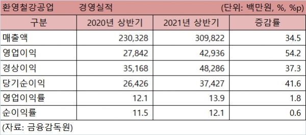 이에 환영철강공업의 2021년 상반기 매출액영업이익률은 13.9%로 전년 동기 대비 1.8%p 상승했으며, 매출액순이익률은 12.1%를 나타내 지난해 같은 기간 대비 0.6%p 올랐다.