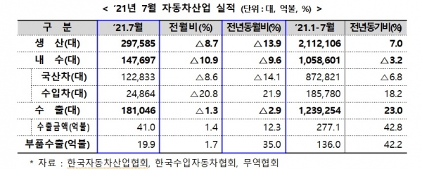 산업통상자원부에 따르면 7월 자동차 생산은 29만7,585대를 기록해 전년 동월 대비 13.9% 감소했다. 조업일수가 감소했으며 차량용 반도체 수급 애로, 현대차 아산공장 설비공사 등 주요 공장 휴업의 영향을 받았다.