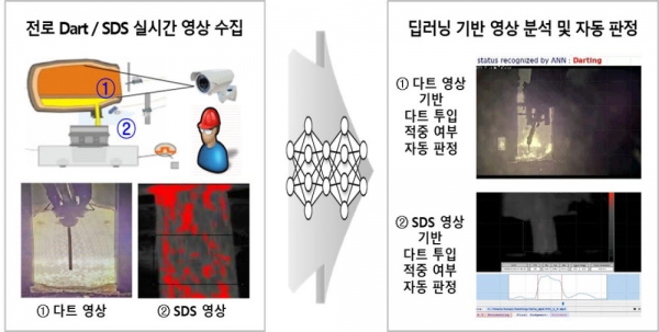 연구팀은 전로 출강 자동화를 위해 포스코 기술연구원, 광양제철소 제강부와 협업해 영상분석 연구를 수행했다. CCTV를 통해 실시간으로 수집되는 다트(내화물) 투입 영상과 SDS(Slag Detection System) 영상을 이용해 딥러닝 기반 다트 투입 적중 여부 자동 판정 기술을 개발했다.