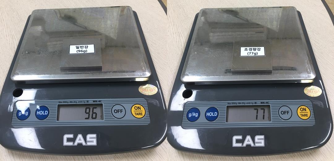 동일한 크기의 일반 철강과 개발 경량 스테인리스 철강의 무게 비교