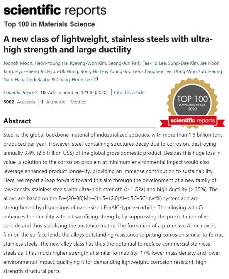 한국재료연구원(KIMS, 원장 이정환) 철강재료연구실 이창훈 박사 연구팀의 연구성과가 '2020년 사이언티픽 리포트(Scientific Reports) 재료분야 Top 100'에 선정됐다. 해당 연구성과는 기존의 스테인리스 철강 대비 약 20% 가벼운 경량 스테인리스 철강을 세계 최초로 개발한 기술이다.