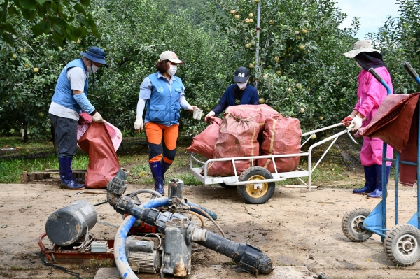 직원들은 피해 복구를 위해 주말을 맞아 수해 지역을 찾았다. 사진, 붓글씨, 정리정돈, 컴퓨터수리봉사단 4개 재능봉사단은 지동리, 일광리, 입암리에 위치한 과수농가 침수 개소 복구를 도왔다. 자전거수리봉사단은 봉사단 특색을 살려 침수로 망가진 자전거를 점검하고 수리했다.
