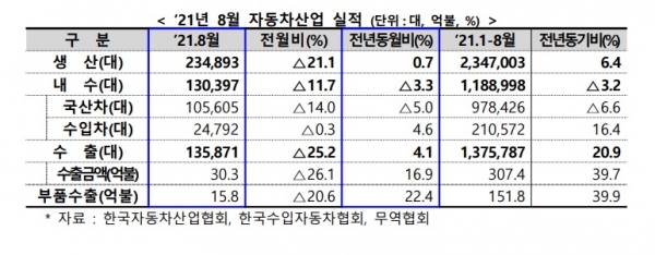 산업통상자원부에 따르면 지난 8월 자동차 생산은 전년 동월 대비 0.7% 증가한 23만4,893대를 기록했다. 차량용반도체 수급난, 전기차 라인공사 등에 따른 주요공장 휴업에도 불구하고 수출 호조에 따라 생산이 늘어났다. 업체별로는 현대차, 기아, 르노삼성은 수출 호조가 생산 증가로 이어졌으나 한국GM과 쌍용은 부품수급(차량용 반도체 등) 영향으로 생산이 감소했다.